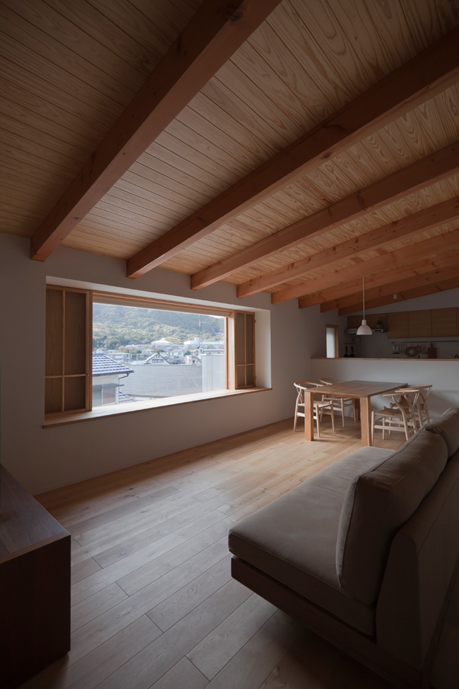 2階リビング開口部から見える風景。季節を通して山肌を望む事ができる。両際の木窓は通風用。